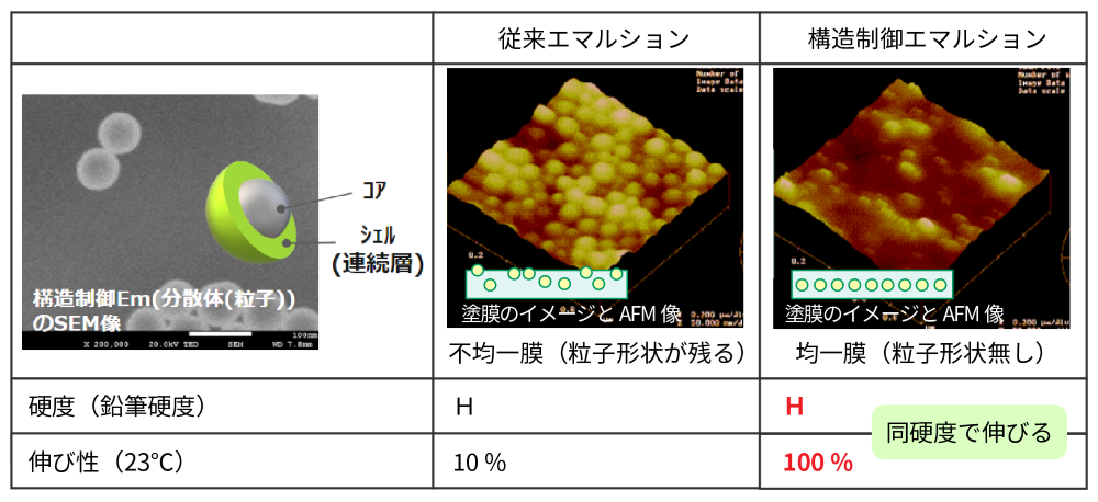 硬度(硬さ、高Tg)と伸び性(柔らかさ、低Tg)など、相反する性能の両立や官能基の粒子表面局在化などが設計可能です。